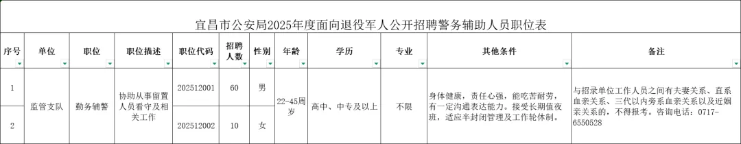 附件1:宜昌市公安局2025年度面向退役军人公开招聘警务辅助人员职位表.xlsx